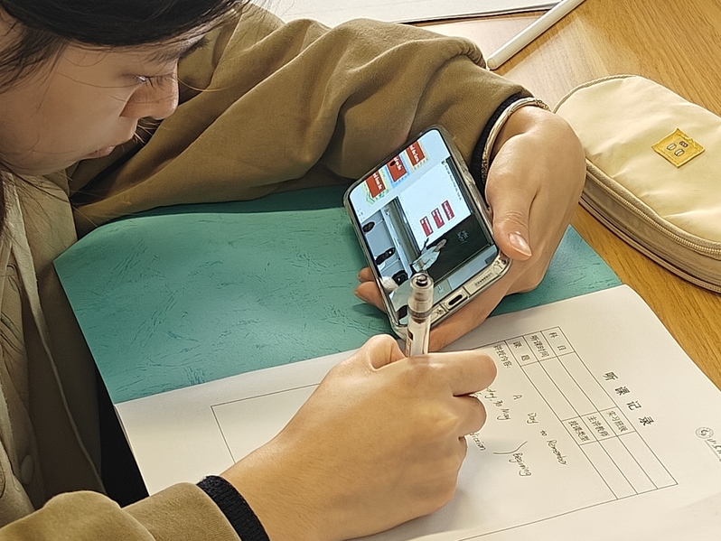 观课过程中,全体学生专注投入,一边跟随直播节奏记录教师的课堂环节设计和学情反馈技巧,一边在手册留白处写下即时思考和待解疑问,字里行间满是对教学实践的深度探索,形成“眼随课动、手随思记、脑随学转”的良好观课氛围,切实将直播课中的教学感受转化为书面反思,为下一阶段的持续性讨论和学习积累素材。