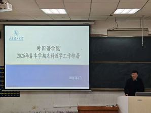 会上,于志涛回顾总结了学院2025年各项工作中取得的成绩与进展,深刻分析了外语学科当前发展面临的新形势与新挑战,并围绕学院关键指标,对2026年的重点工作进行周密部署和动员。他指出,新学期学院要进一步完善引育并举人才体系,强化“外语+”赋能,聚焦高端成果,靶向发力,实现各项工作新突破。他强调,全体外语人要展现智慧和担当,向下扎根,向上生长,共同推动学院各项事业再上新台阶。