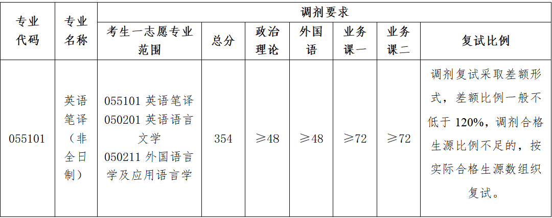 专业学位:055101英语笔译,同等学力考生复试时需要加试高级英语和翻译理论与实践。每门考试科目满分100分,时间2小时,低于60分为不合格。成绩不计入复试总成绩,不合格者不予录取。