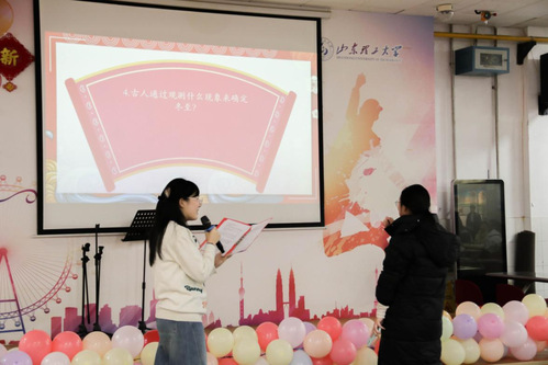 除动手实践外,活动还设置“冬至知识挑战赛”趣味环节。比赛分为“快问快答”与“谜语接龙”两轮,题目既涵盖冬至历史习俗,又结合外语专业特色,融知识性与趣味性于一体。同学们踊跃参与、对答如流,在轻松互动中深化了对传统文化的认知,也展现出扎实的专业素养。